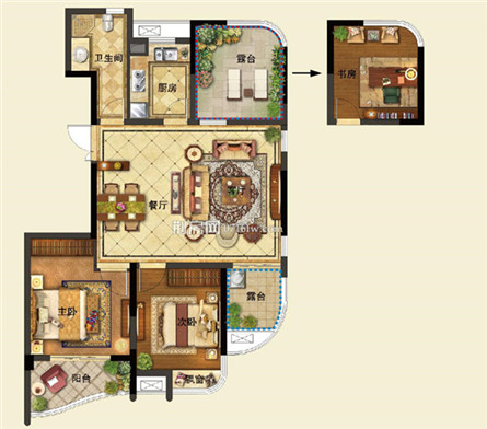 优点:客厅与餐厅一体化设计,增加室内空间。主卧自带私密卫生间,赠送观景飘窗,享受舒适生活。超大的客厅景观阳台,独立书房与次卧连接观景阳台,尽情欣赏窗外美景。