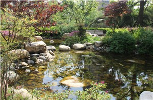 小桥流水,大块的湖石错落摆放,水生植物下红色的小鱼游来游去。